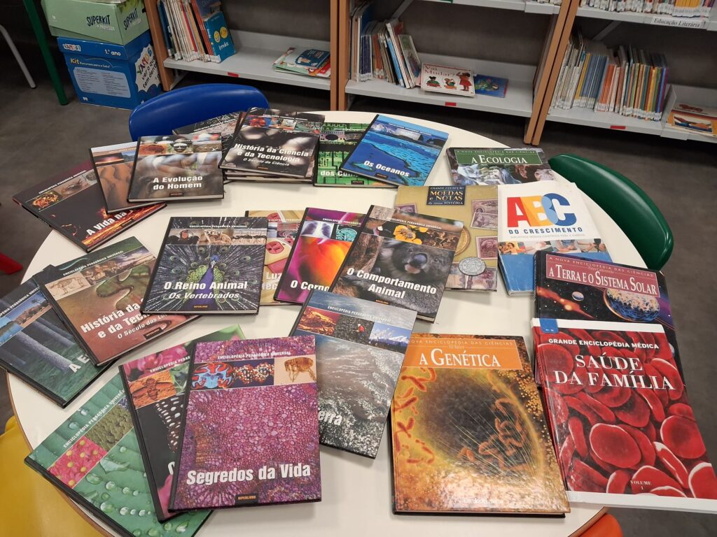Também a seção de obras de Enciclopédias ( Classificação CDU 0 e 53/54) foi ampliada com a entrada de algumas obras doadas por um familiar de um aluno, de quem respeitamos o anonimato, mas a quem muito agradecemos o gesto solidário e amigo.