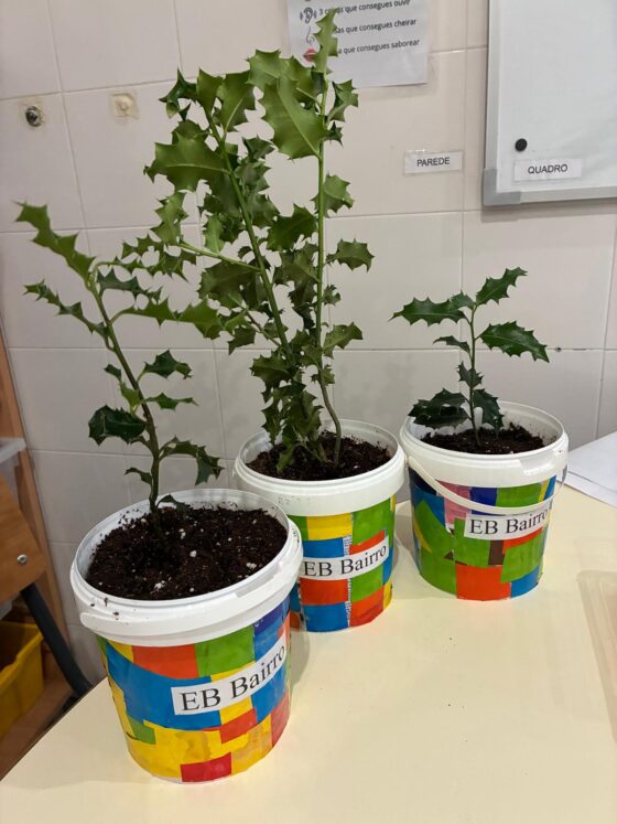 No dia 5 de junho os alunos da escola de Bairro celebraram o Dia Mundial do Ambiente com diferentes atividades. Em contexto de CAA os alunos realizaram trabalhos visando sensibilizar a comunidade escolar para a necessidade de proteger o meio ambiente, reutilizando materiais, reduzindo a utilização de recursos naturais e promovendo o cultivo de espécies autóctones. Os alunos decoraram baldes de iogurtes com restos de papeis coloridos e plantaram azevinhos, que ofereceram aos professores e que levaram para a sua família. A turma G2B construiu vasos ecológicos com recurso a materiais de desperdício, com a mensagem: “Vamos proteger a Natureza com abraços de Amor e SEMENTESde Esperança”. Elaboraram cartazes que colocaram nos espaços comuns da escola.