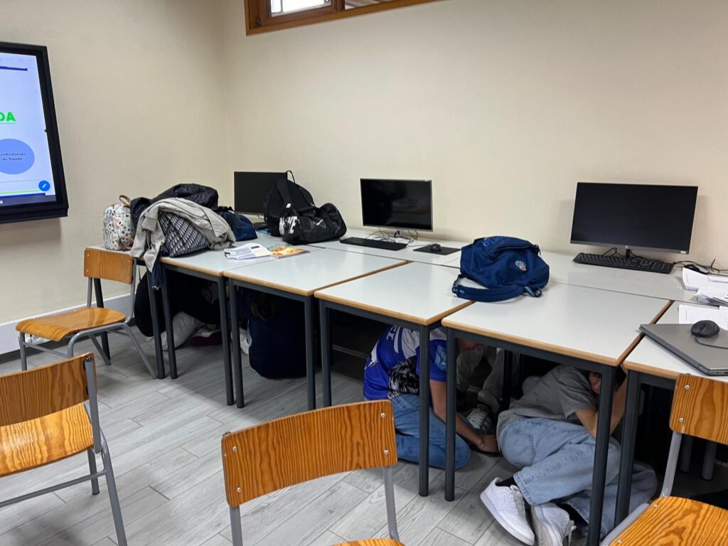 Ao longo do minuto que durou a atividade, alunos, professores e funcionários seguiram as recomendações de segurança, abaixando-se, protegendo-se sob mesas ou outras superfícies seguras e aguardando de forma tranquila. Estes gestos simples e rápidos promovem a criação de rotinas que podem fazer a diferença em situações de emergência.