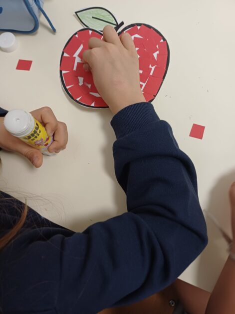 Para completar o projeto, os alunos construíram um flyer, em forma de maçã, com conselhos úteis para os pais, incentivando hábitos alimentares mais saudáveis em família.