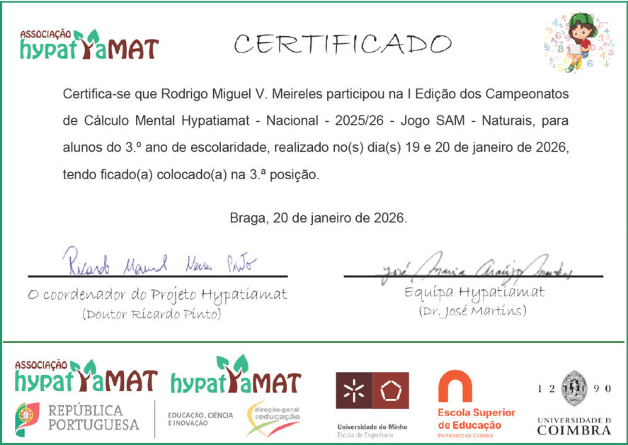 Rodrigo Meireles, da turma G3B, da EB Bairro, AE Terras do Ave fica colocado na 3ª posição, a nível nacional, num universo de 18632 alunos, na 1ª edição do Campeonato de Cálculo Mental Hypatiamat Online – 2025/2026,de âmbito nacional no jogo SAM – Naturais, para alunos do 3º ano, que se realizou nos dias 19 e 20 de janeiro. Este aluno ficou em 1º lugar na Escola e no Agrupamento de Escolas Terras do Ave.