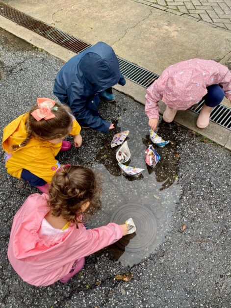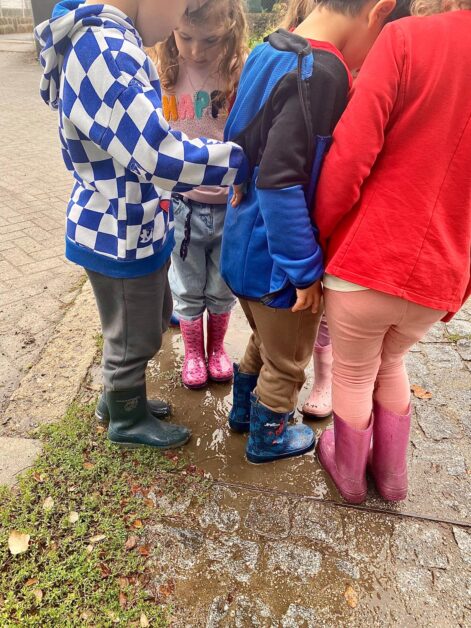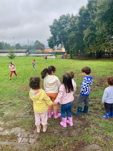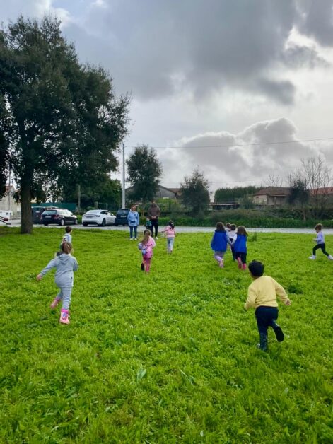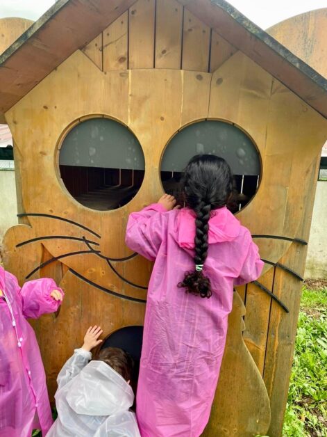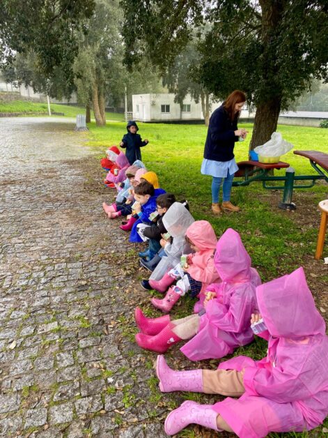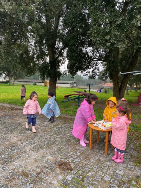 No JI de Bente as crianças têm um recreio e uma “floresta” onde podem explorar a lama para fazer “comida”, saltar nas poças, observar a natureza e sentir a chuva, procurar animais e colecionar elementos naturais, estimulando os seus sentidos e criatividade, em conexão com o meio ambiente, transformando a chuva em memórias duradouras. Apesar do Inverno chuvoso que temos tido, estes espaços exteriores têm sido largamente utilizados, graças à colaboração das famílias no envio do equipamento necessário, e do professor do projeto camarário “Brincar a Torto e a Direito”, que demonstra interesse em aí desenvolver algumas sessões.