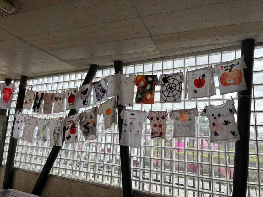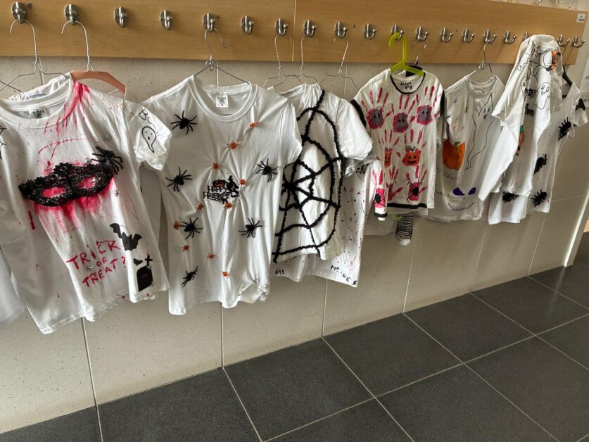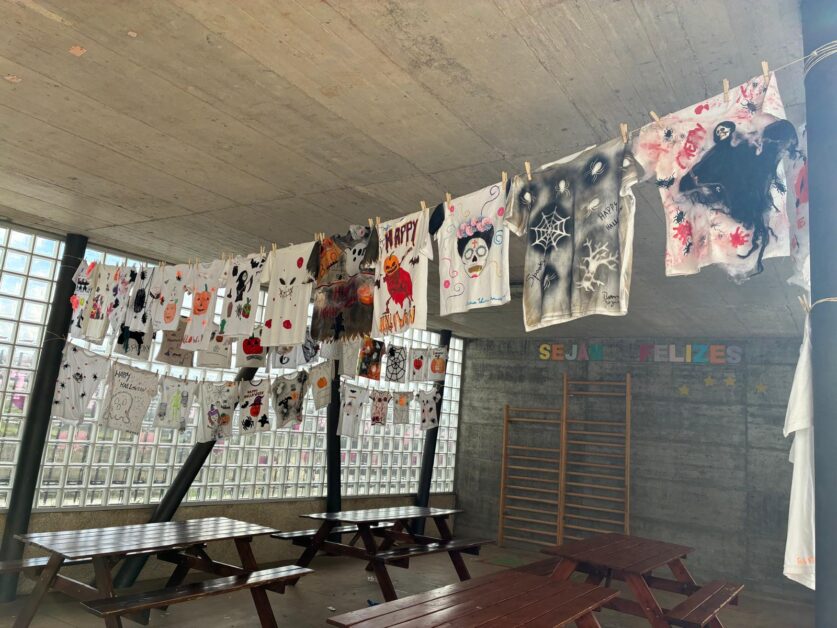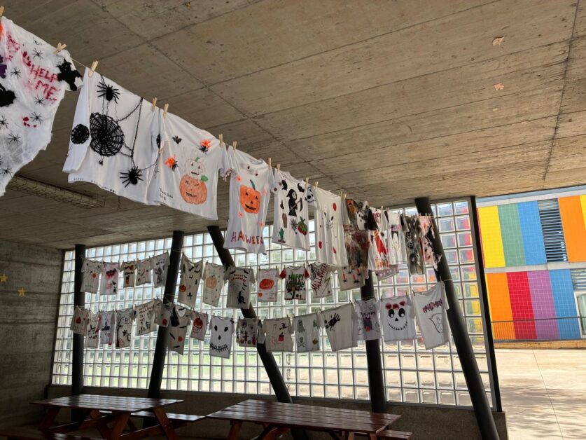 As famílias também participaram, colaborando na decoração e pintura de t-shirts temáticas, que depois foram expostas no átrio da escola, transformando o espaço numa verdadeira galeria de arte assustadoramente criativa.