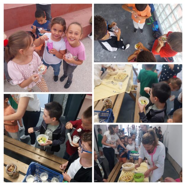 Durante a manhã, cada aluno trouxe de casa uma peça de fruta, que foi depois cortada e misturada para criar uma grande variedade de sabores. Os alunos puderam escolher as frutas que mais apreciavam e adicioná-las ao seu iogurte, natural ou de morango, num lanche coletivo preparado com dedicação e entusiasmo.