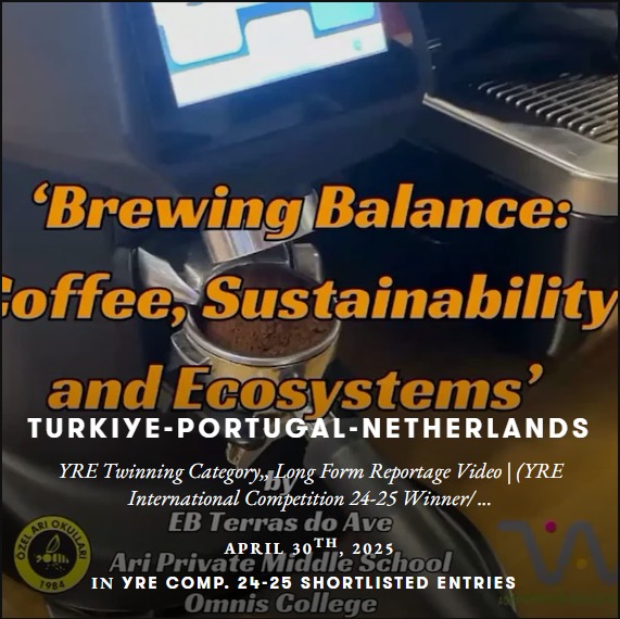 Destas, 37 instituições foram selecionadas como vencedoras da competição Internacional da YRE 2024-2025, e a EB Terras do Ave foi uma delas, ficando no 3.º lugar na categoria TWINNING CATEGORY, Long-form Reporting, com o trabalho “Brewing Balance: Coffee, Sustainability and Ecosystems”, uma colaboração entre a EB Terras do Ave, a Ari Private Middle School (Turkey) e a Omnis College (Netherlands).