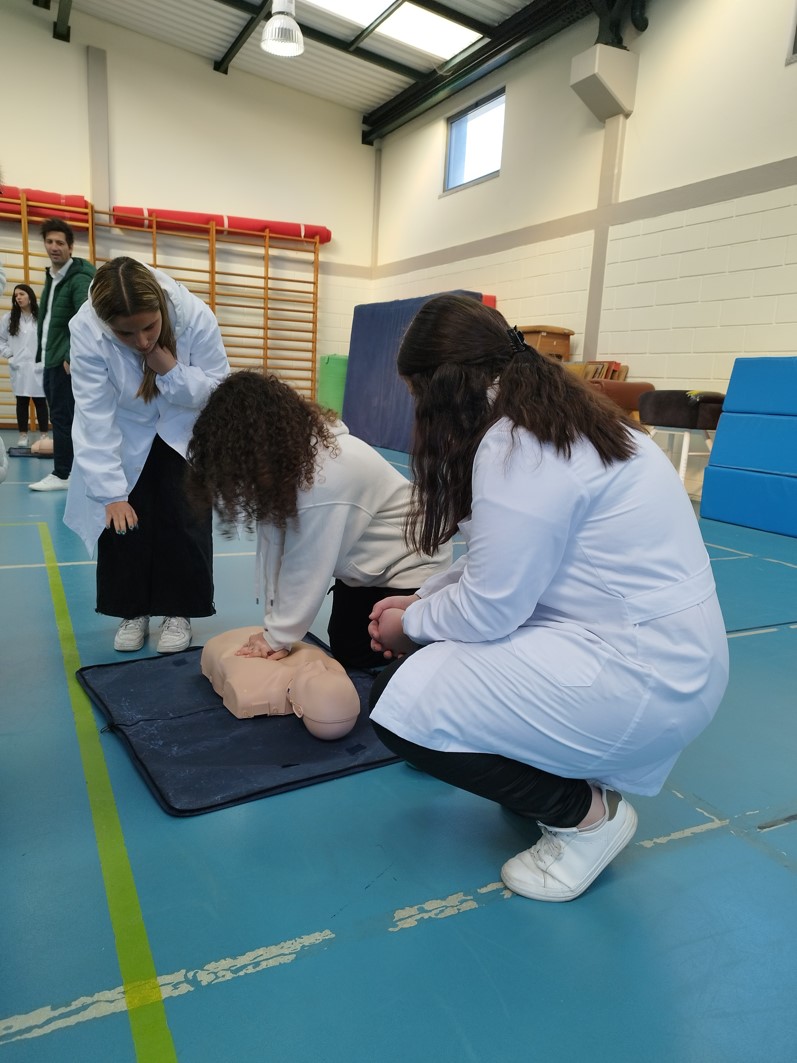 Os alunos de 9º ano rememoraram como se realiza o exame do paciente com base na abordagem inicial do ABC (airway, breathing and circulation), executaram procedimentos de Suporte Básico de Vida adulto e pediátrico, seguindo os algoritmos do European Resuscitation Council e assistiram à demonstração da posição lateral de segurança.
