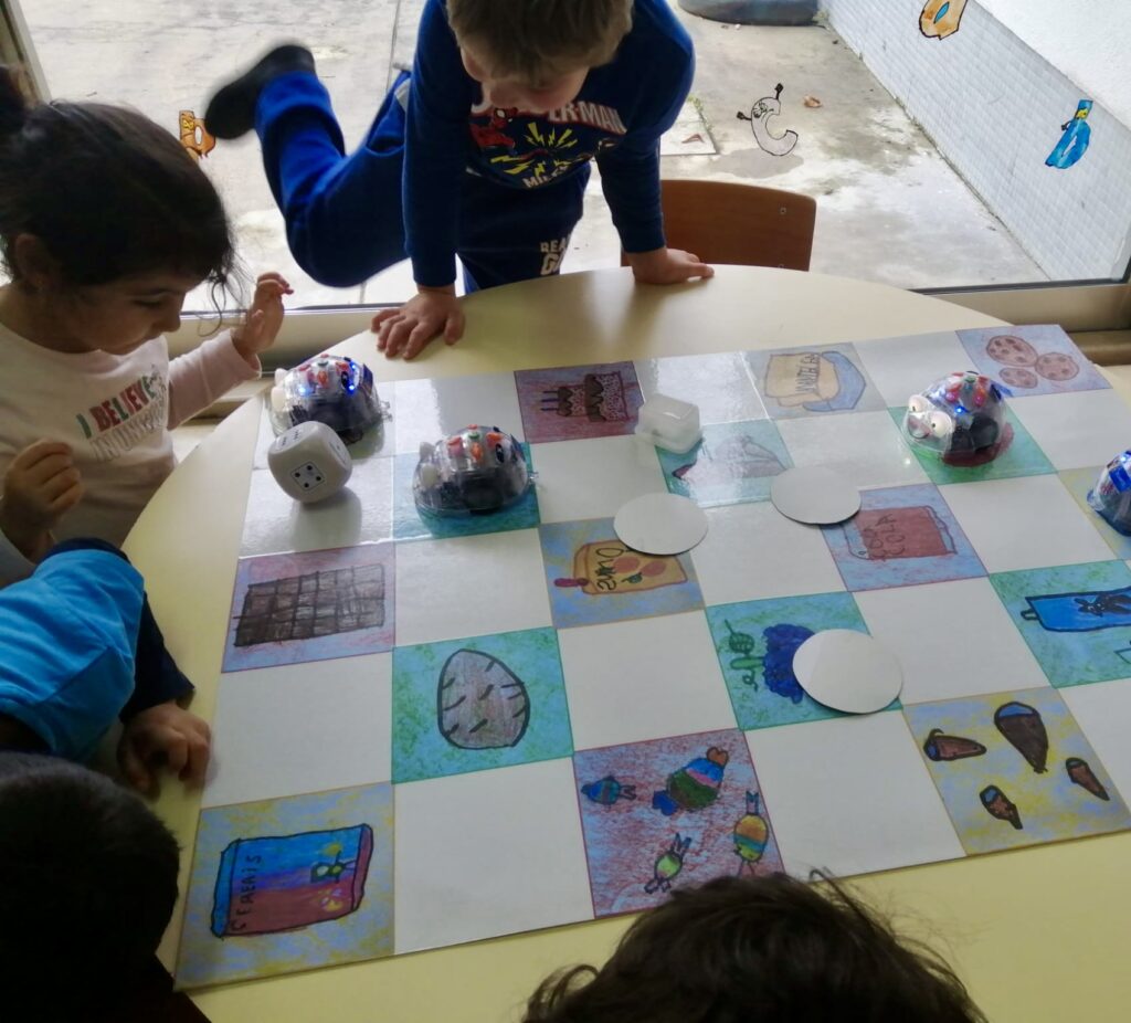 Em grande grupo, foram apresentadas as atividades do dia, registadas previamente no mapa do planeamento, em resultado das ideias e sugestões das crianças, na continuidade do trabalho que tem vindo a ser desenvolvido sobre as temáticas da alimentação e da paz: programação dos robôs Bee-Bots no tapete/ jogo construído a partir dos desenhos das crianças e montagem de símbolos da paz com alimentos, na mesa de luz. As crianças planearam o trabalho nas áreas de saber; desenvolveram os seus projetos e atividades, de acordo com a planificação realizada e em interação com os pares; e apresentaram ao grupo o trabalho realizado, partilhando igualmente as aprendizagens que daí resultaram.