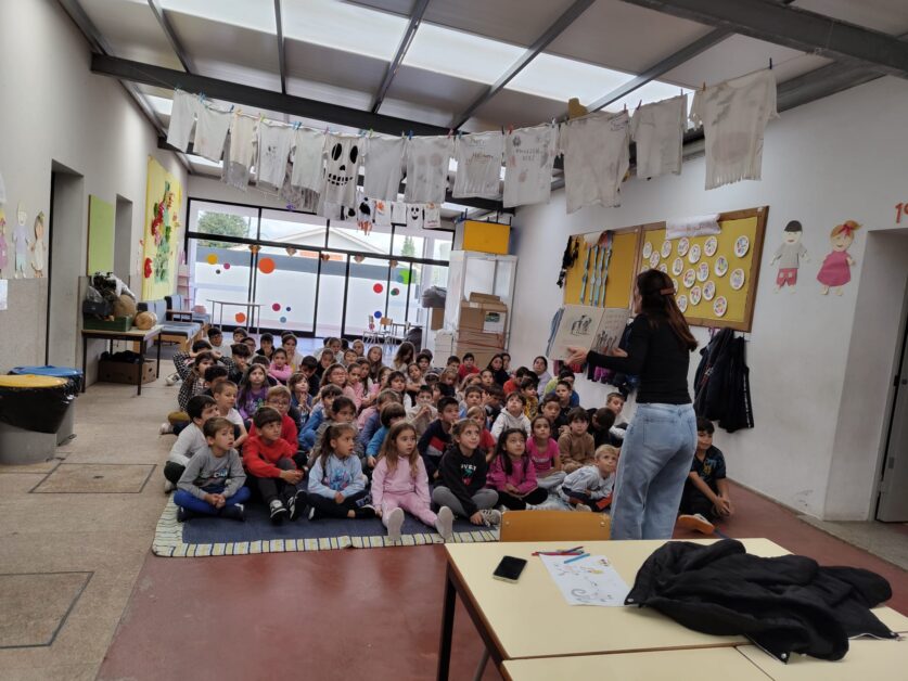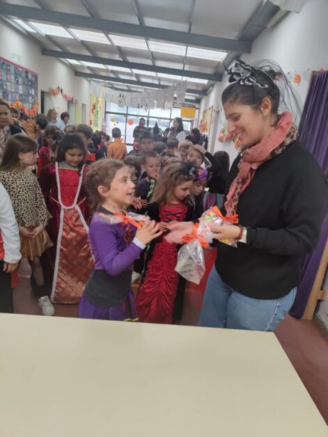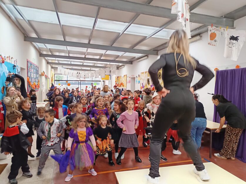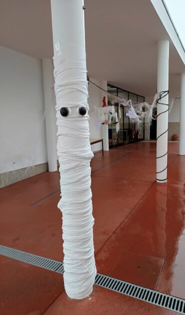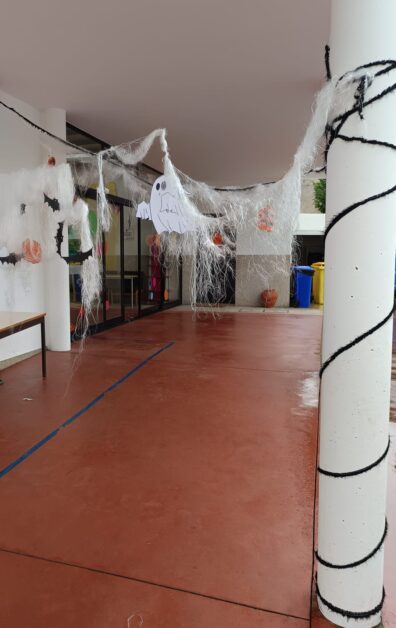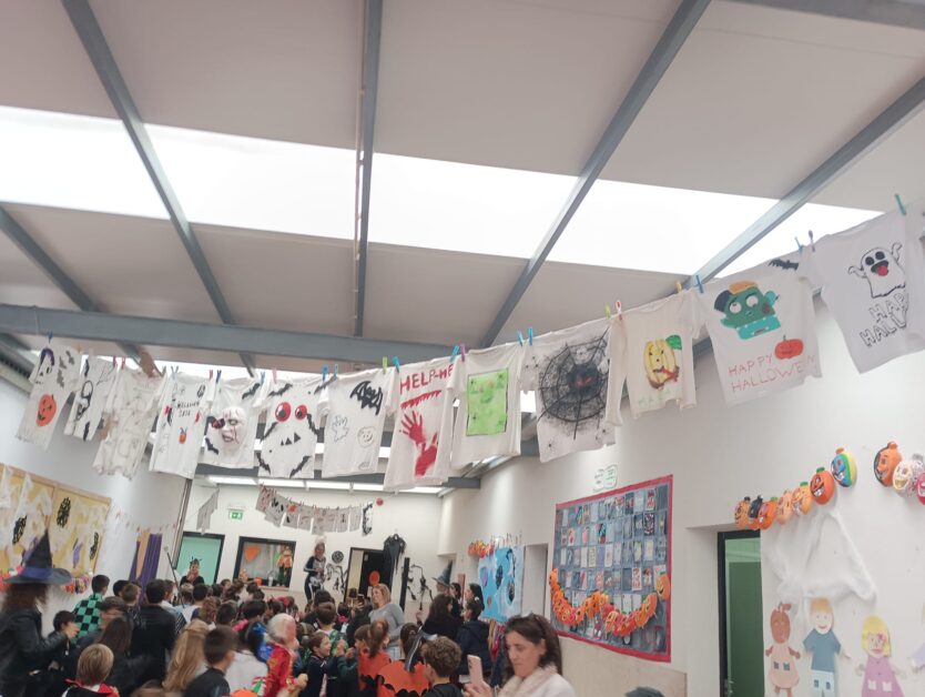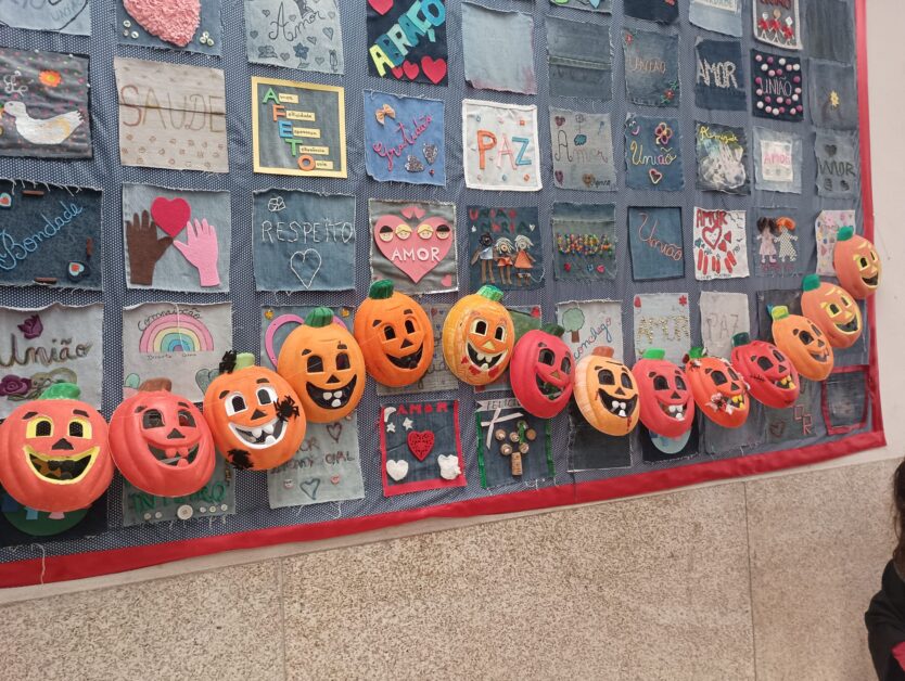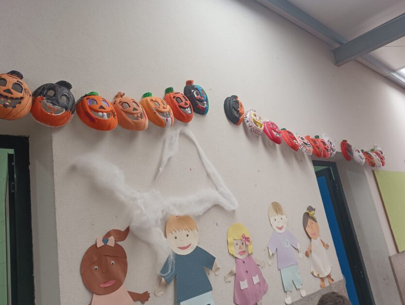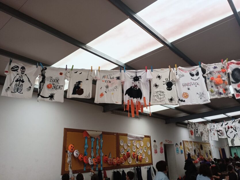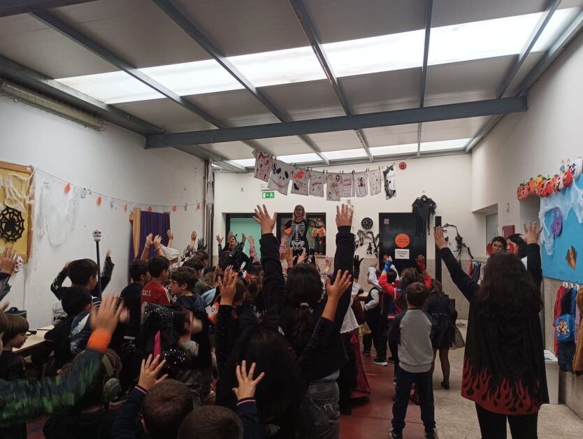 A EB de Oliveira Santa Maria viveu uma semana assustadoramente divertida, dedicada ao Halloween. O tema foi trabalhado de forma criativa e envolvente em várias áreas e projetos. Nas aulas de Inglês, os alunos do 3.º e 4.º anos decoraram T-shirts com muita imaginação, explorando vocabulário e símbolos típicos desta celebração. No âmbito do projeto “Mente Feliz”, a animadora Ângela Rodrigues dinamizou, em grande grupo, uma história, promovendo a reflexão e o trabalho emocional. Todas as crianças da escola pintaram uma máscara de cartão, gentilmente oferecida pela Associação de Pais, que depois serviram para uma colorida e divertida decoração do espaço escolar. O culminar da semana aconteceu no dia 31 de outubro, com uma animada atividade de dança, dinamizada pela Associação de Pais, que contou com a participação de toda a comunidade educativa. As crianças foram ainda surpreendidas com deliciosas guloseimas.Foi, sem dúvida, uma semana repleta de criatividade, movimento e espírito de Halloween! 🎃