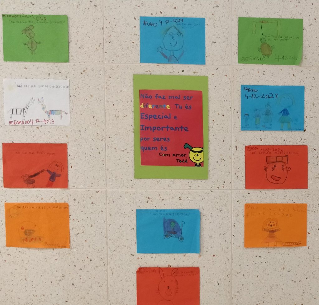 A história “Não faz mal ser diferente” de Todd Parr serviu de mote para sensibilizar as crianças para a diferença. As crianças ouviram a história e realizaram trabalhos sobre o tema.