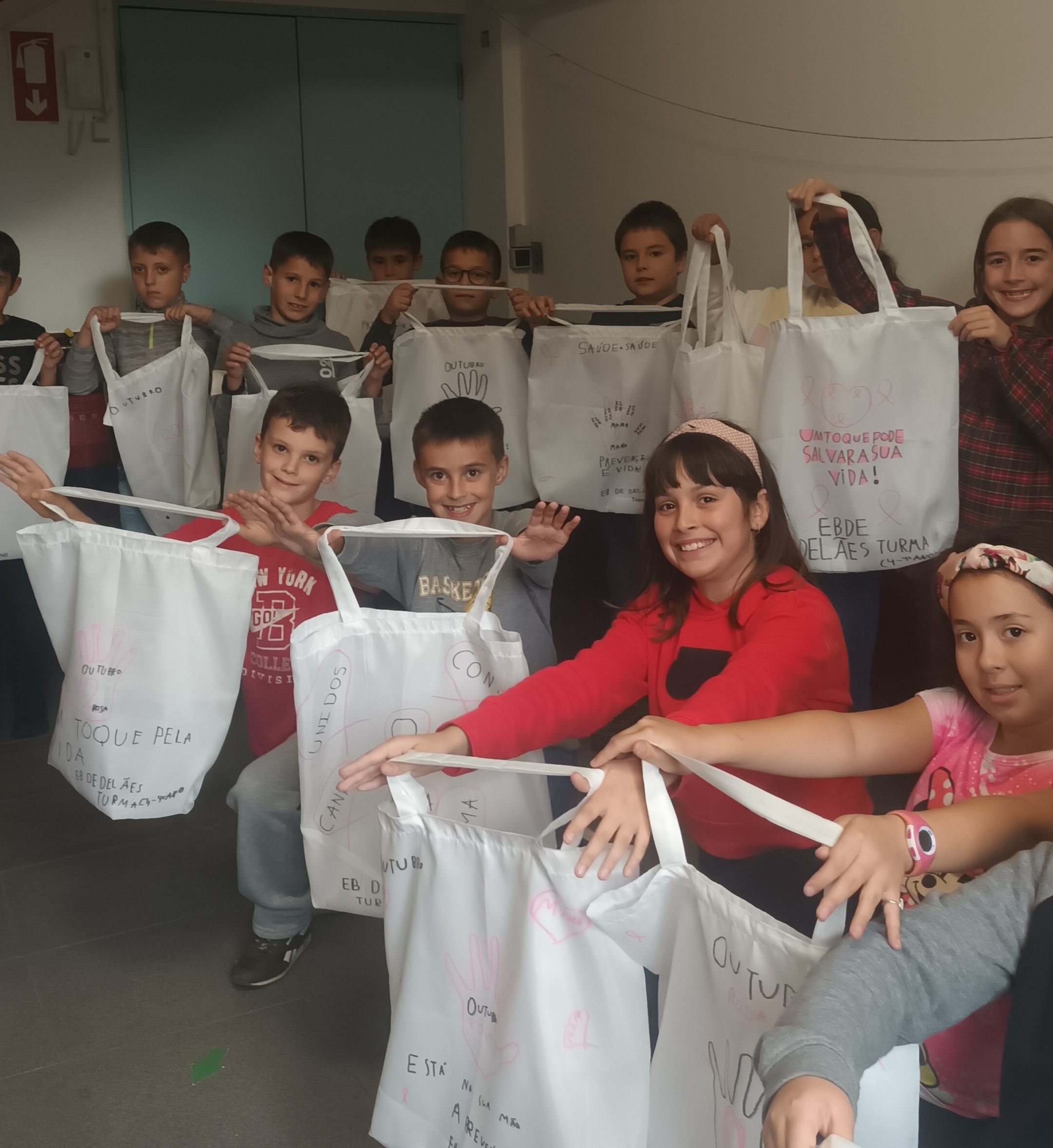 Os alunos da Turma do 4º ano da EB de Delães refletiram sobre a importância da prevenção e diagnóstico do cancro da mama e promoveram a sensibilização da comunidade com a inscrição de mensagens de consciencialização, em sacos ecológicos.