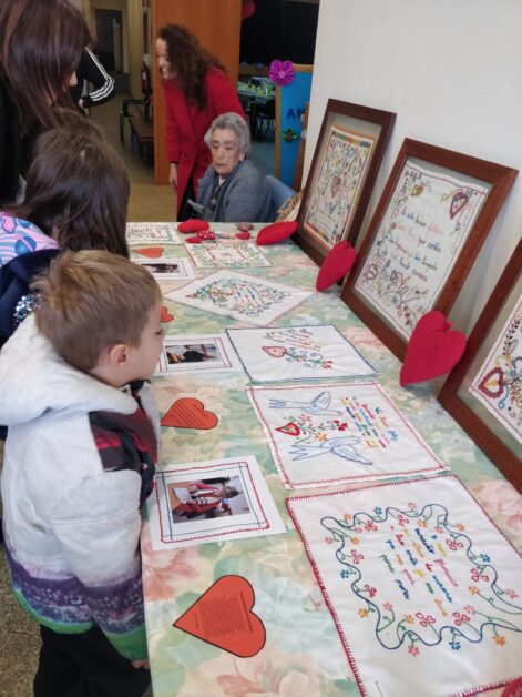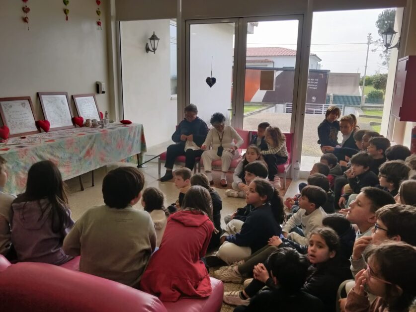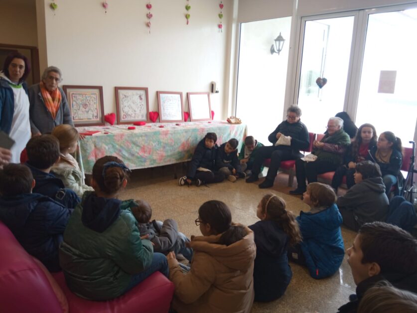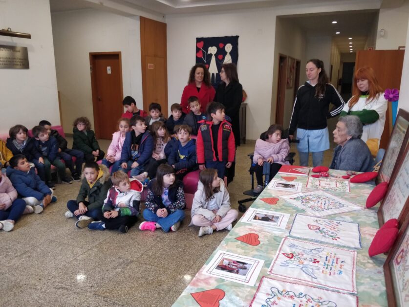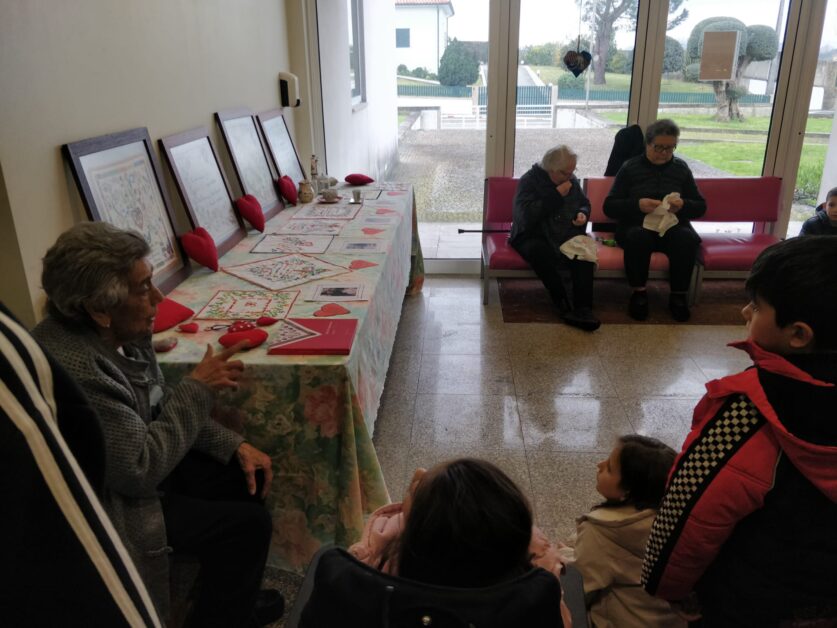 Os alunos da escola de Bairro foram convidados pelos utentes do Centro de Dia para experienciar a execução de lenços dos namorados e conhecer a sua origem. Ao longo da semana de 17 a 21 de fevereiro, em grupo de ano, os alunos da escola de Bairro puderam observar as bordadeiras na execução dos lenços, ver a exposição de trabalhos realizados, no âmbito do “Dia de S. Valentim”, pelos idosos que frequentam o Centro de Dia do centro Social de Bairro. As utentes do Centro de Dia partilharam com as crianças a história dos lenços dos namorados, o significado dos desenhos e as mensagens transmitidas. Os alunos leram as mensagens, ficando curiosos face aos erros nas palavras bordadas, ficando a saber que antigamente a população tinha menos escolaridade e escrevia como falava.