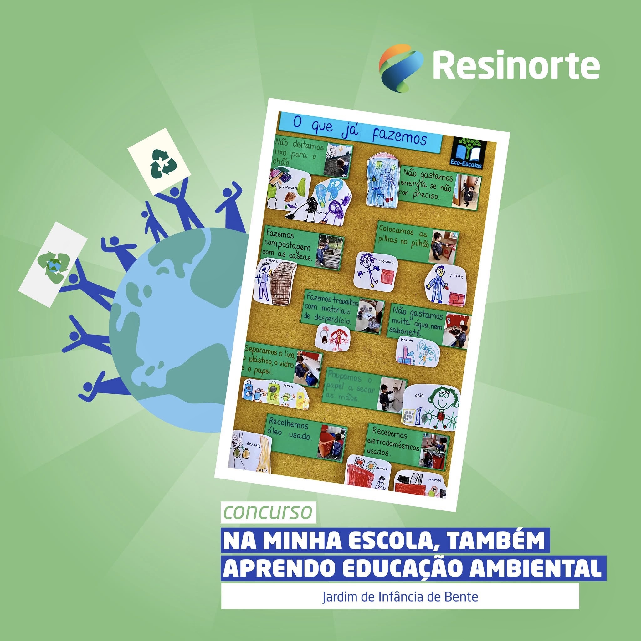 Os meninos do Jardim de Infância de Bente (AETA) orgulham-se de terem sido os vencedores do concurso, promovido pela Resinorte, “Na minha Escola também aprendo Educação Ambiental”, sobretudo pelo compromisso que assumem diariamente com o ambiente e a sustentabilidade, a partir do incentivo à sua participação ativa na tomada de decisões e na resolução dos problemas ambientais. O resultado foi anunciado nas redes sociais da empresa: https://www.instagram.com/p/DGBWVLQiBOw/?utm_source=ig_web_copy_link&igsh=MzRlODBiNWFlZA==